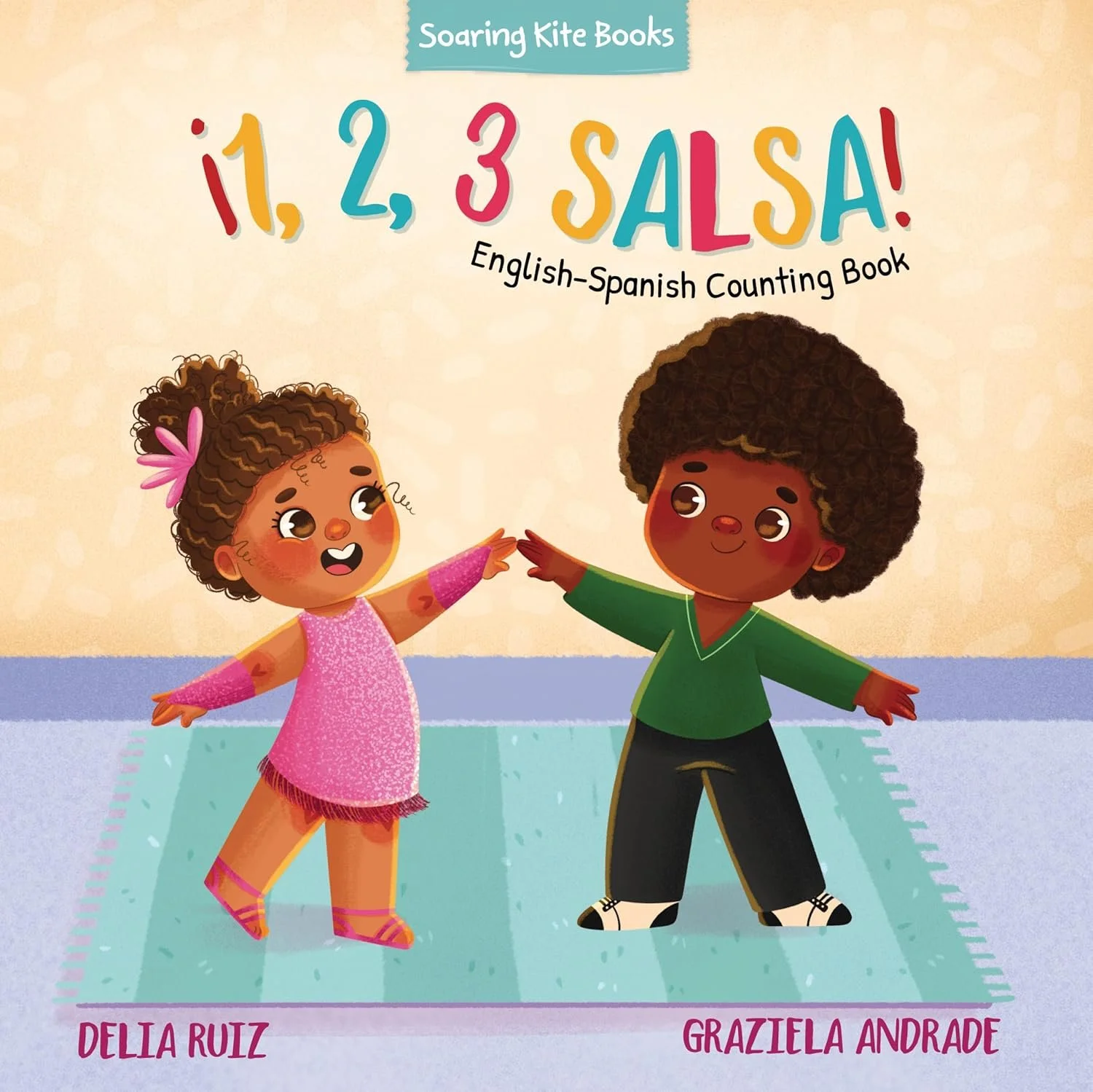 ¡1, 2, 3 Salsa!: English-Spanish Counting Book (2023) by Delia Ruiz (author) & Graziela Andrade (illustrator) [Board Book] — Each page of this bilingual counting book features a different aspect of Salsa dancing, for example, "Two dancing shoes make a pair," and "Three turns make my hair swish-swish-swish."