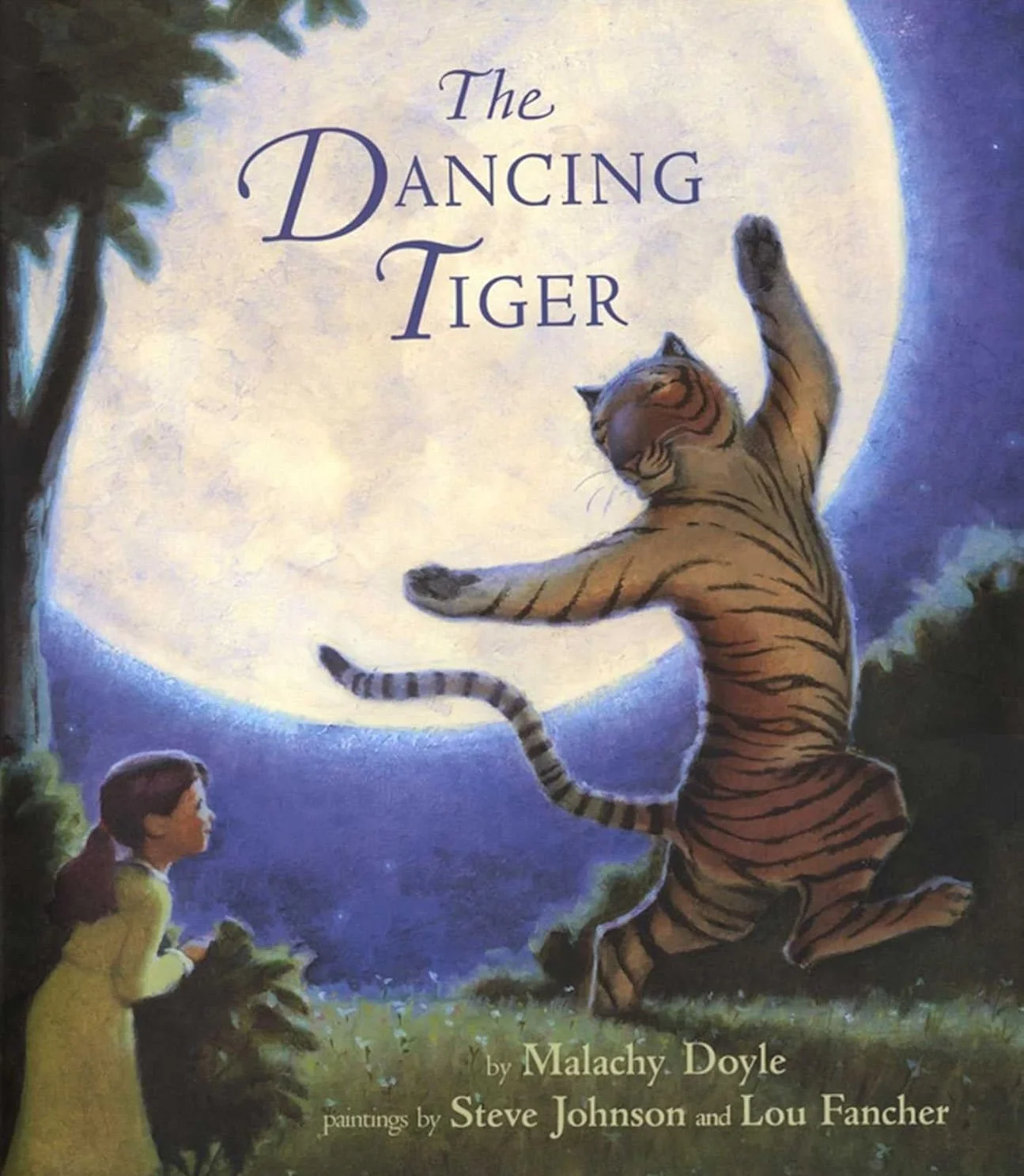 The Dancing Tiger (2005) by Malachy Doyle (author), Steve Johnson, & Lou Fancher (illustrators) [Picture Book] — In this beautifully illustrated picture book, a girl, and later, her granddaughter, dance with a tiger in the forest under the moonlight. "We've skipped in the spring through bluebells, / In summer circled slow, / We've high-kicked in the autumn leaves, / And waltzed in winter snow."