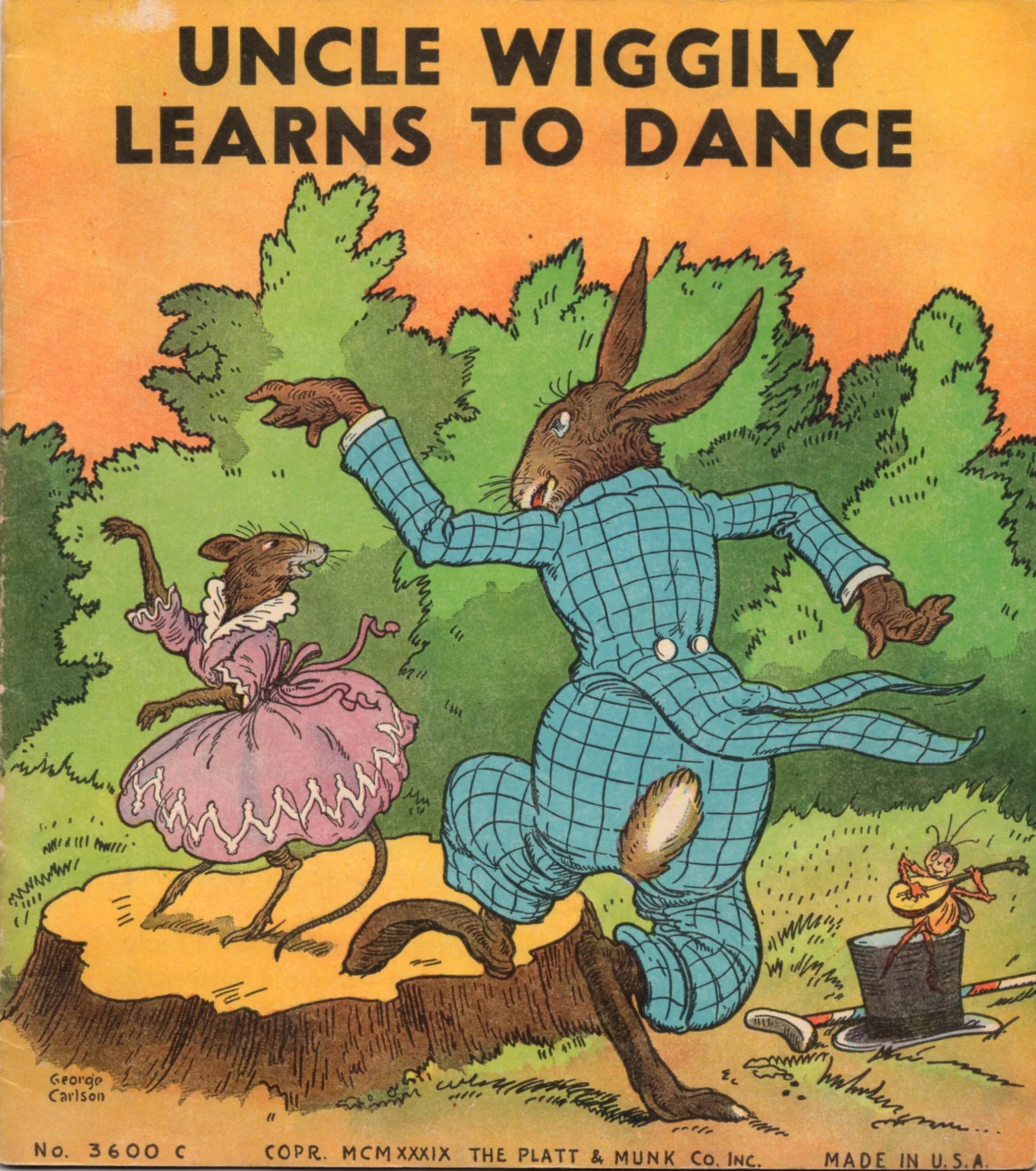 Uncle Wiggly Learns to Dance (1939) by Howard R. Garis [Picture Book] — In this dance-themed volume in the massive, early-20th century Uncle Wiggily series, Uncle Wiggily takes secret dance lessons from the mouse in the forest. "Waltzing mouse is having fun, / Showing how it should be done. / Cricket plays so merrily / Watching Uncle Wiggily."