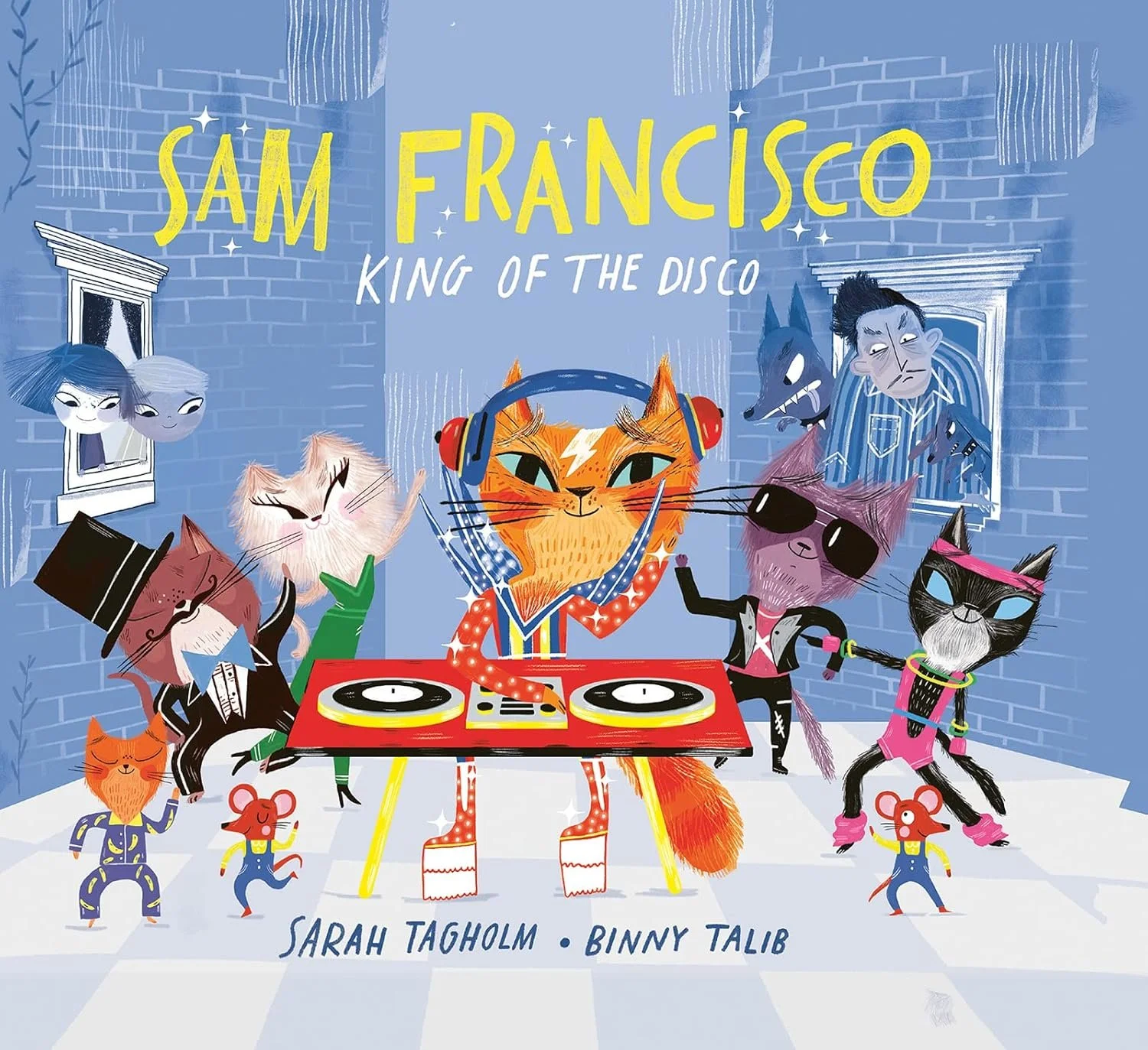 Sam Francisco, King of the Disco (2023) by Sarah Tagholm (author) & Binny Talib (illustrator) [Picture Book] — Sent to shut down the cat's raucous disco dance party, two dogs, a pest control specialist, and even the police and fire brigade can't hold back from joining in on the fun. "The party was incredible, a megaton of fun, and they danced till dawn when they woke the sun."